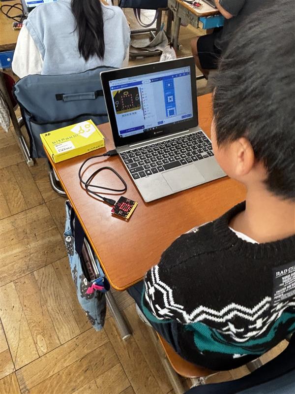 パソコン上でプログラミングしたものを、マイクロビットに映し出す活動に取り組んでいます。自分が考えた模様や動きになるように、試行錯誤しながらプログラムを組んでいく学習です。