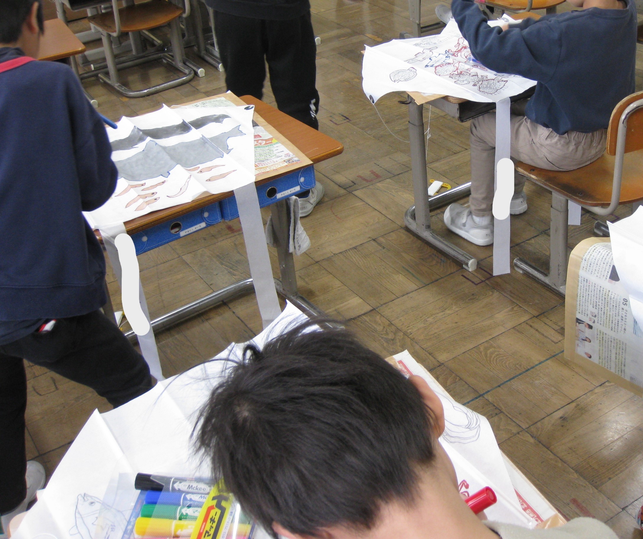図工では、凧の絵付けを行いました。絵の具で丁寧に仕上げ、それぞれのオリジナルの凧が完成しました。23日には校庭で凧あげを行い、凧が高く上がるように、一生懸命走っていました。